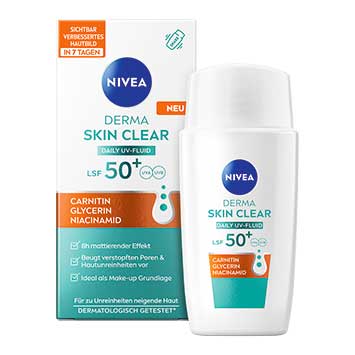Idéale comme base de maquillage, garantie sans résidus blancs: ce fluide ultra-léger matifie le teint, régule la brillance liée au sébum et aide à prévenir les imperfections tout en assurant une protection efficace au quotidien. Fluide UV Daily Derma Skin Clear Nivea (40 ml 17.953)